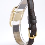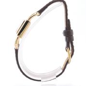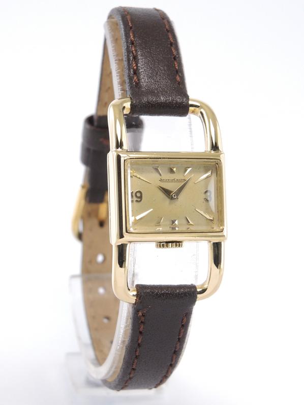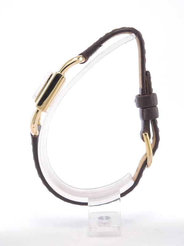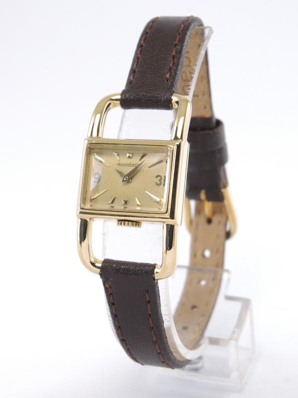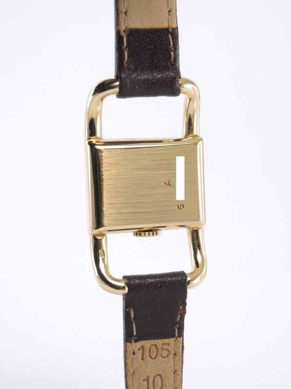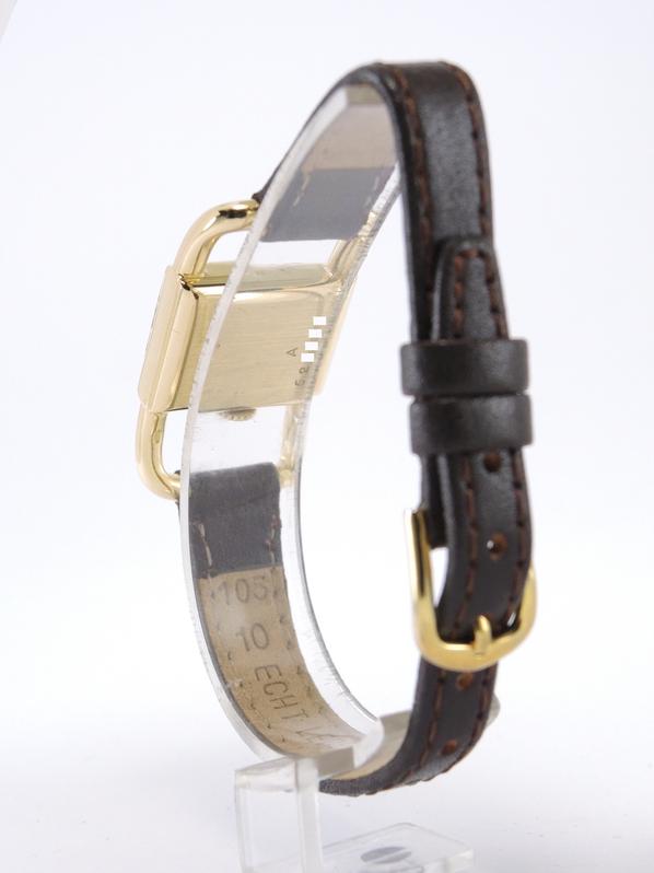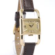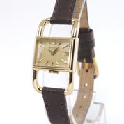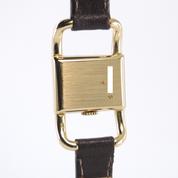 Yellow gold case on leather strap, pin buckle, 20 x 33 mm, off white dial, applied markers, dauphine hands, plexiglass, hand wound movement.