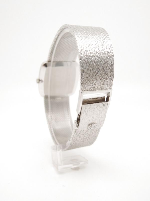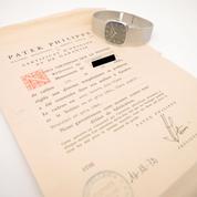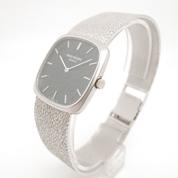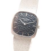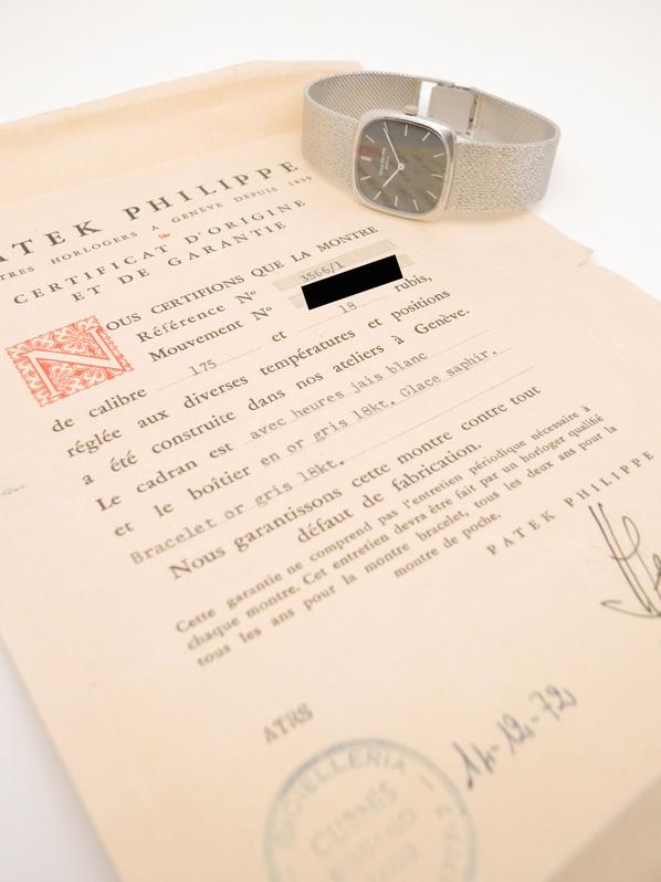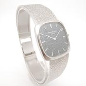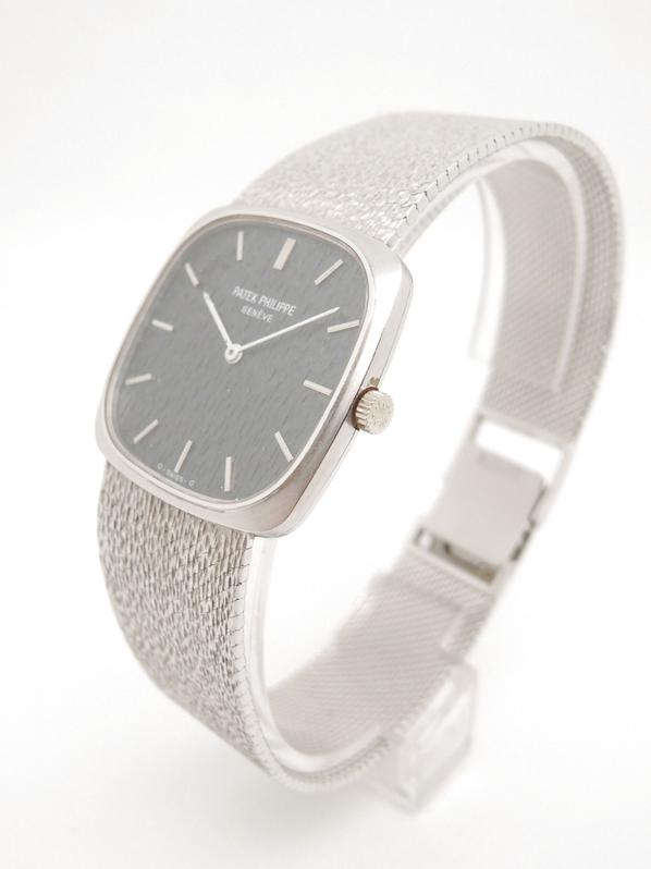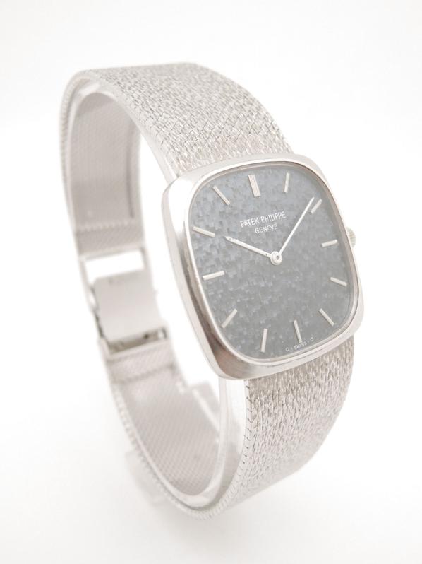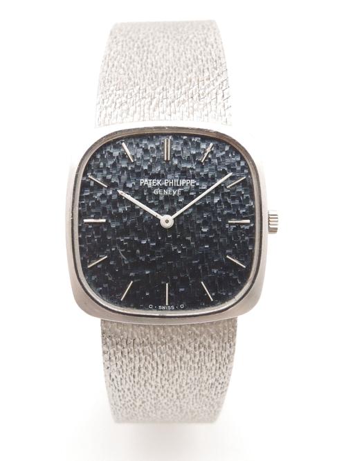 Complete white gold, textured blue dial, white indexes and hands, manual winding movement, Patek-branded crown, maximum wrist size 21cm, delivered with papers, Superb patina in collector's condition