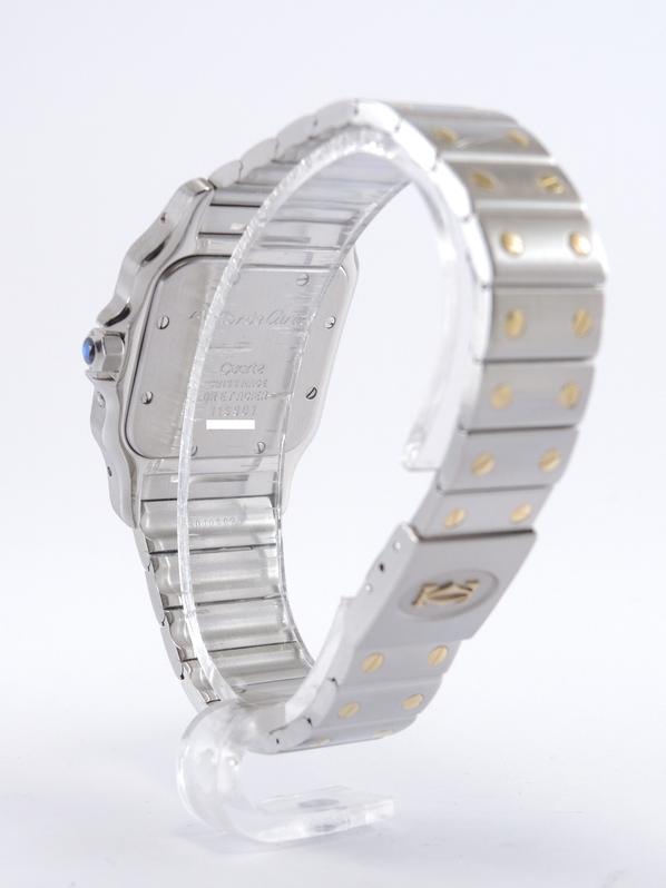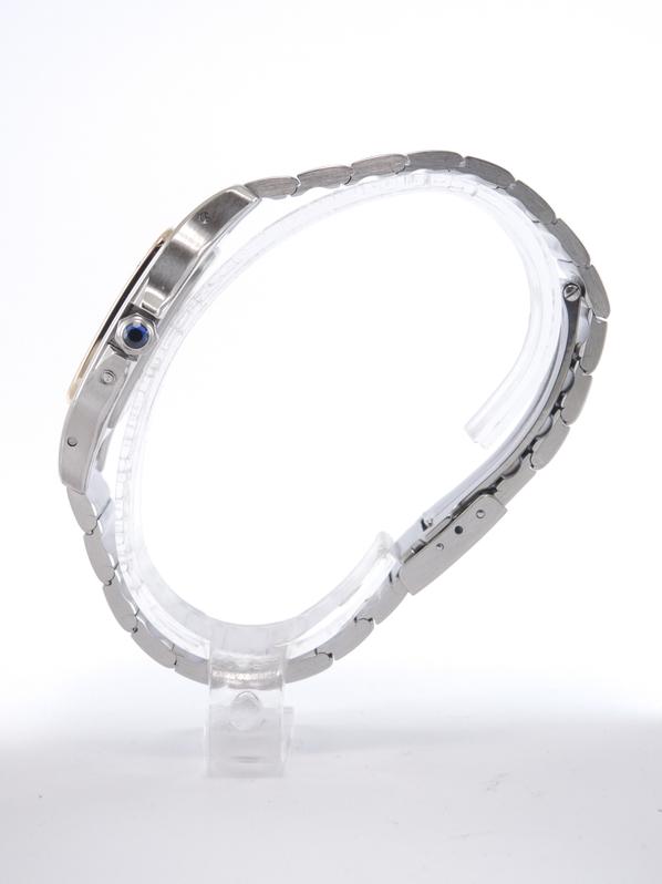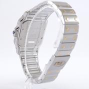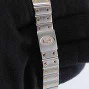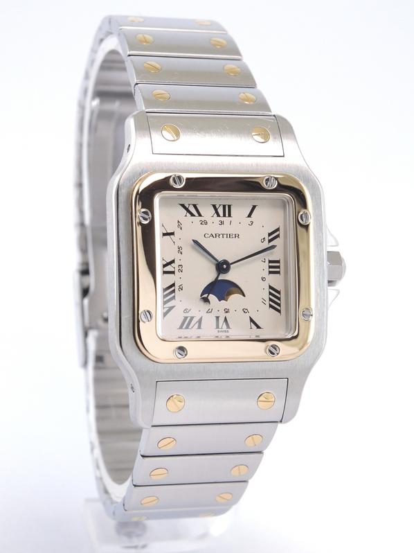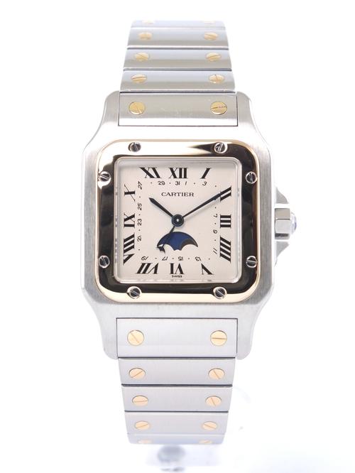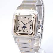 Full yellow gold and steel, 29 x 41 mm, white dial with roman numeral markers,date, moonphase, blued "sword shaped" hands, sapphire glass, quartz movement.