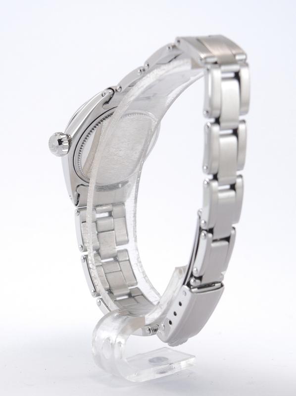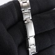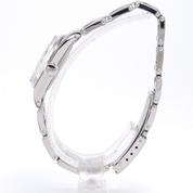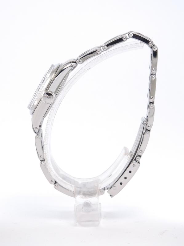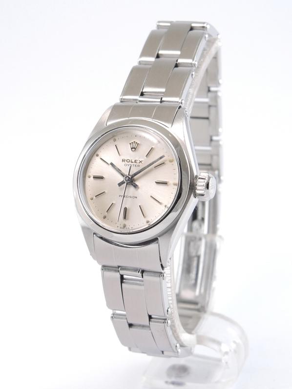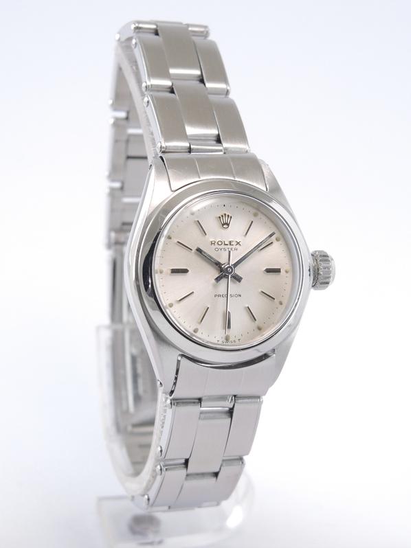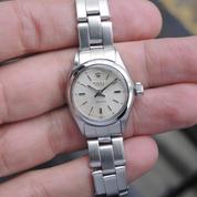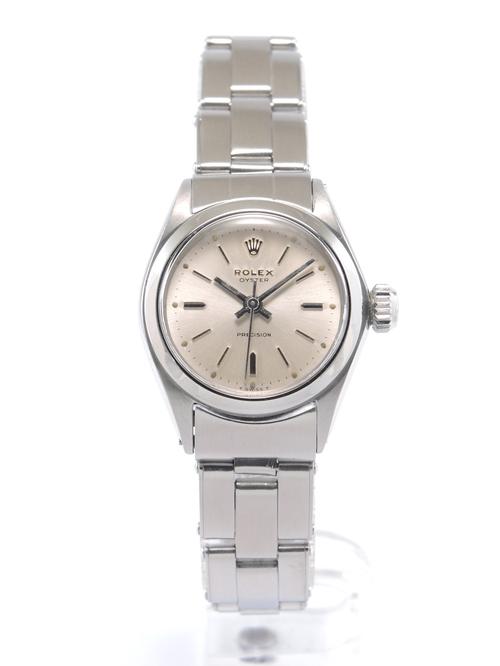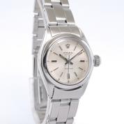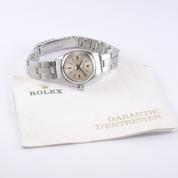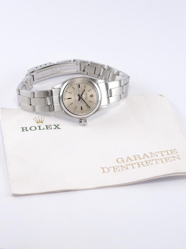 Full Steel, riveted Oyster bracelet, silver dial, applied stick markers, plexiglass, smooth bezel, screw down crown, hand wound movement. Avec papier de service Rolex.