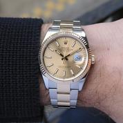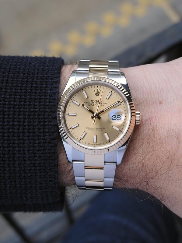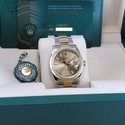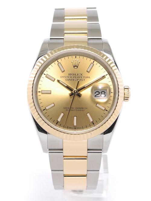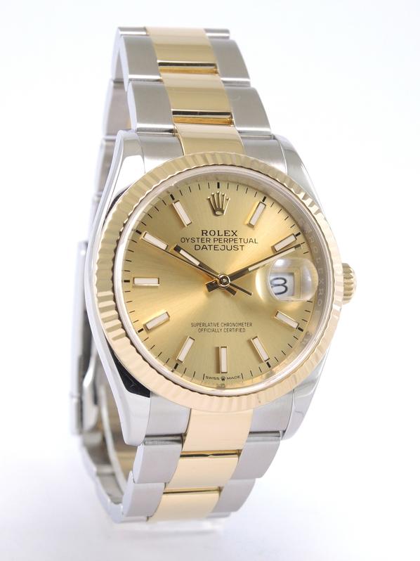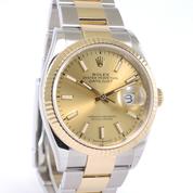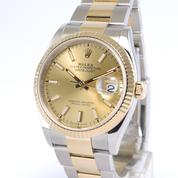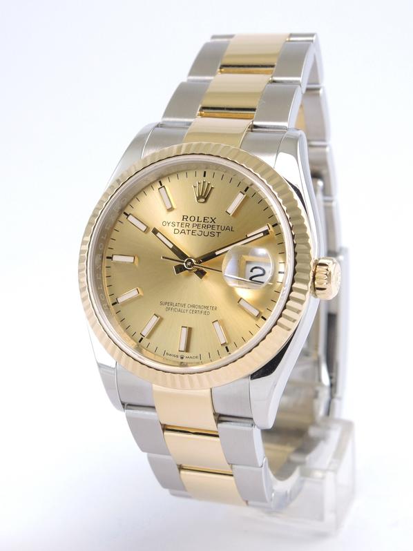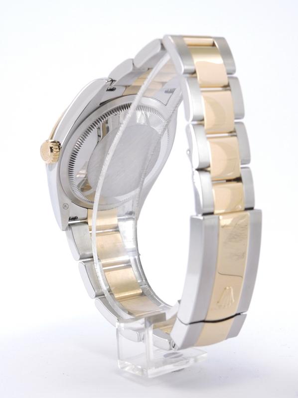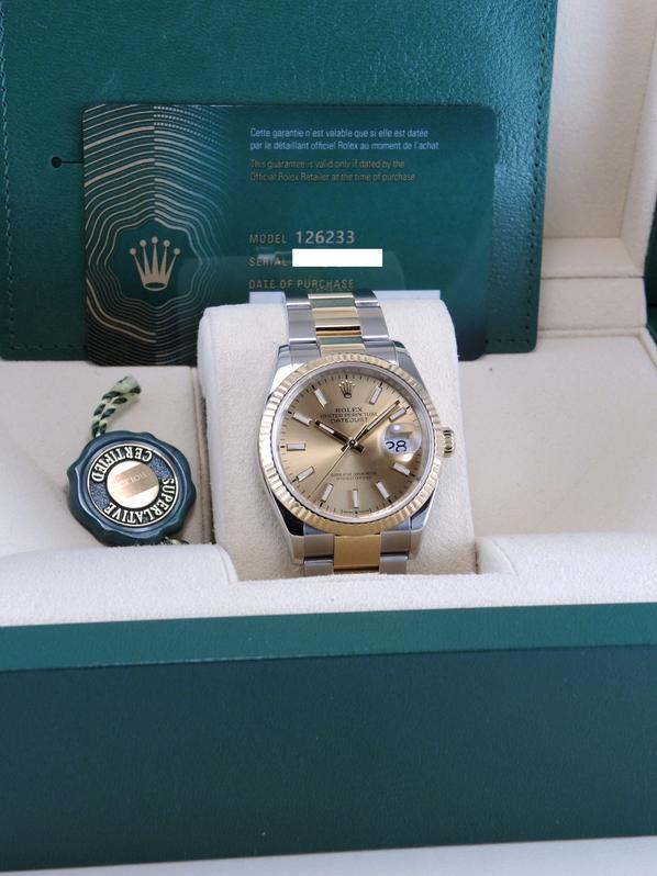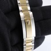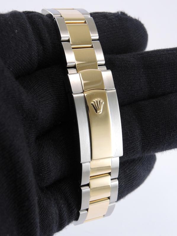 Full yellow gold and steel, Oyster bracelet, golden sunburst dial, applied stick markers, date, sapphire glass, fluted bezel, screw down crown, chronometer certified automatic movement (COSC). With original box and papers, full set!
