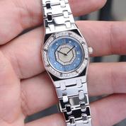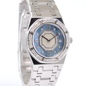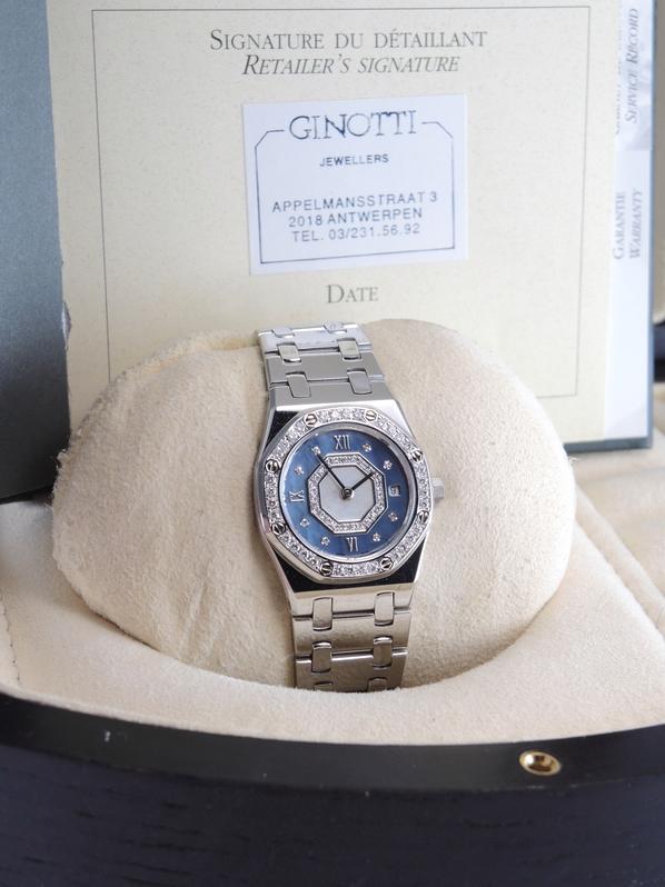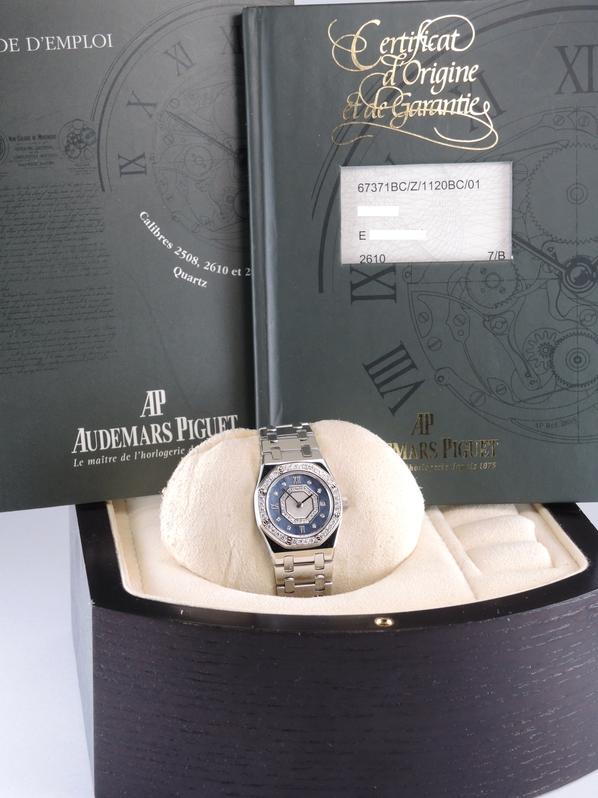 Complet or blanc, cadan nacre bleu serti de diamants, lunette sertie de diamants, date, verre minéral, mouvement quartz. Avec boîte et papiers d'origine, set complet ! Avec entretien complet AP fait en 2025 !