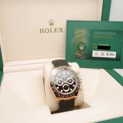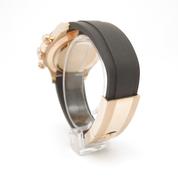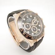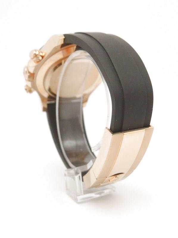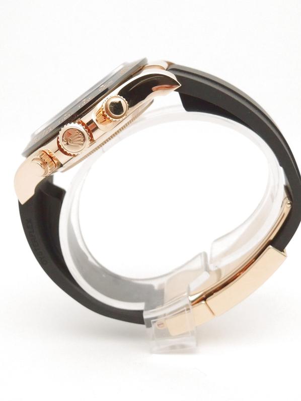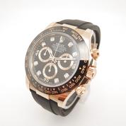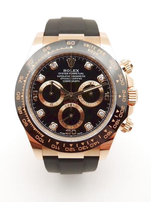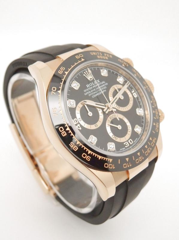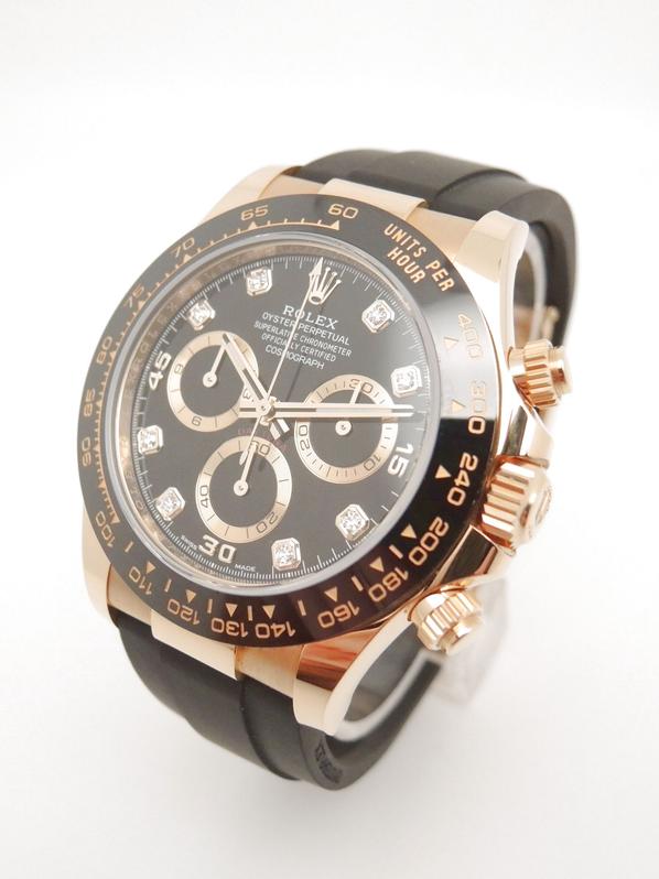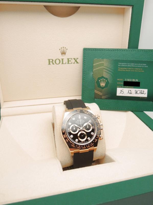 Boitier or jaune sur bracelet caoutchouc "Oysterflex", cadran Noir Index diamants , chronographe, trois compteurs, lunette céramique noire, couronne et poussoirs vissés, verre saphir, mouvement automatique certifié chronographe (COSC). Avec boite et papiers d'origine, set complet ! Comme Neuve !