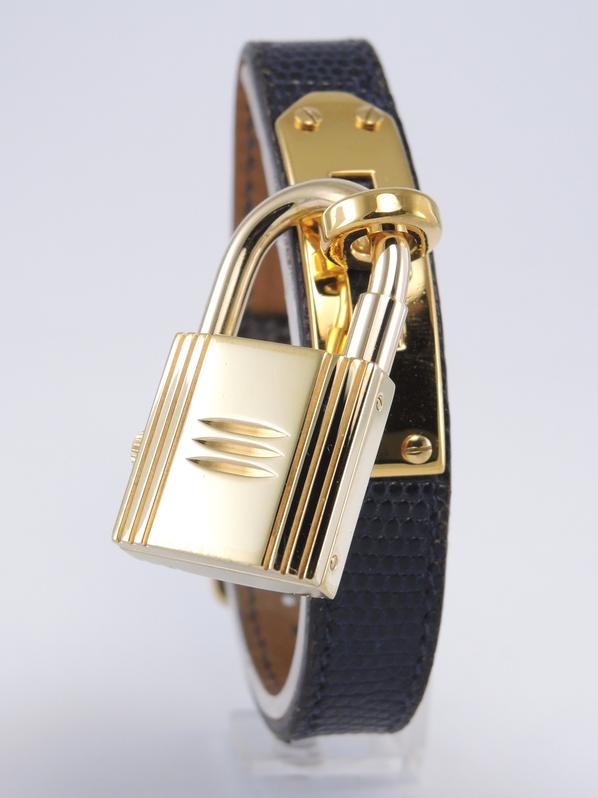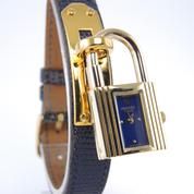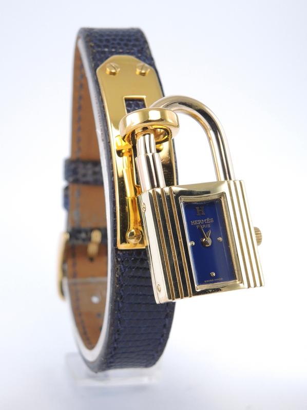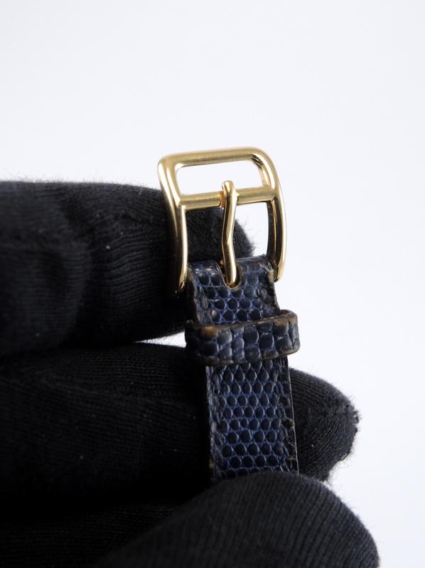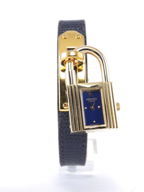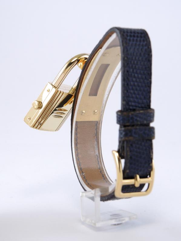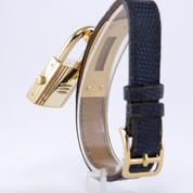 37 x 20 mm - Boîtier "cadenas" plaqué or sur bracelet cuir avec boucle d'origine, cadran bleu, deux aiguilles centrales, cadran et boitier signé Hermès, quartz movement.