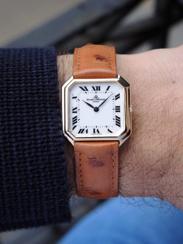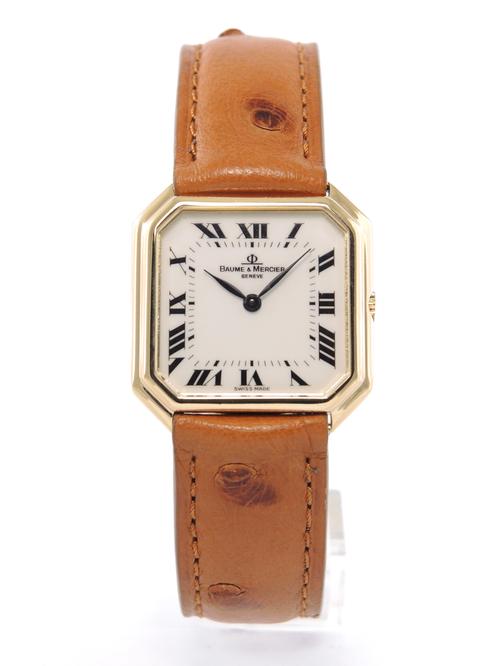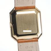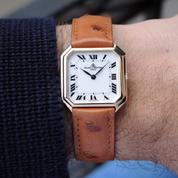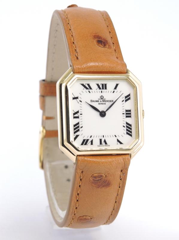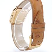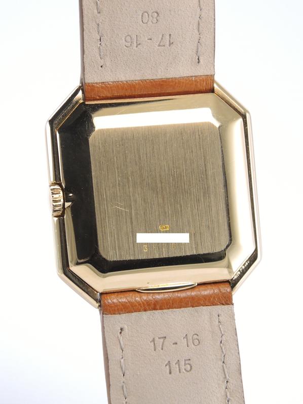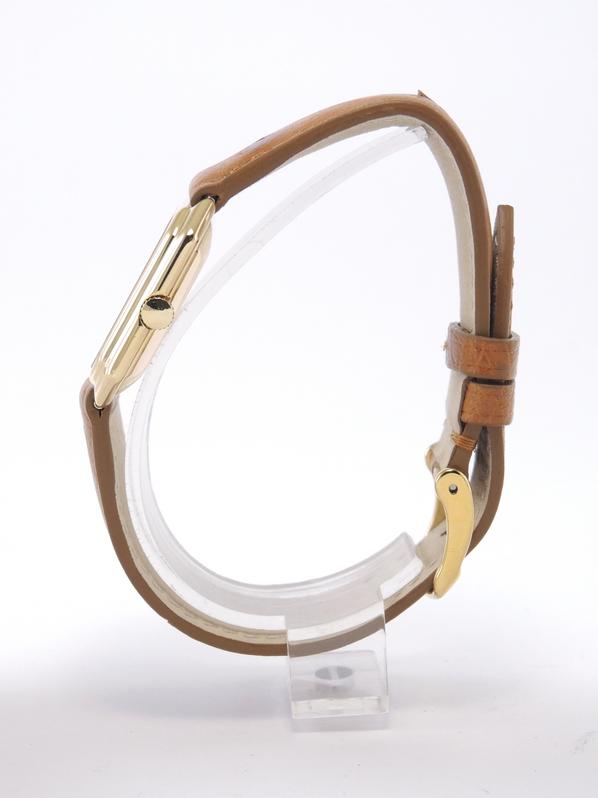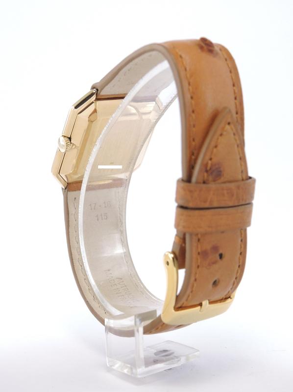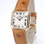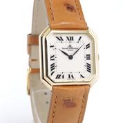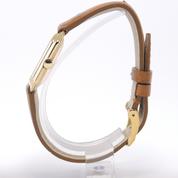 Boitier or jaune 18ct sur bracelet cuir, cadran blanc avec indexes chiffres romans, aiguilles feuilles, verre minéral, mouvement mécanique à remontage manuel.