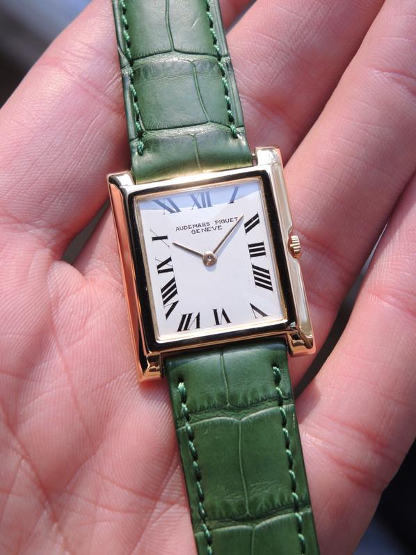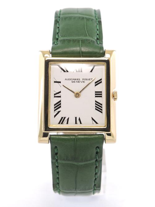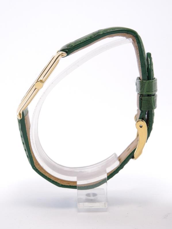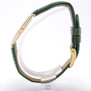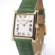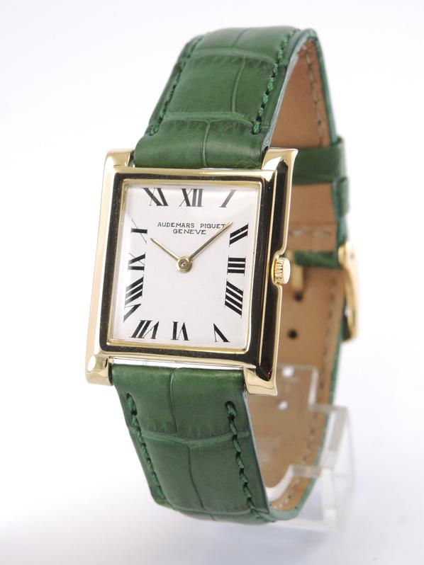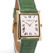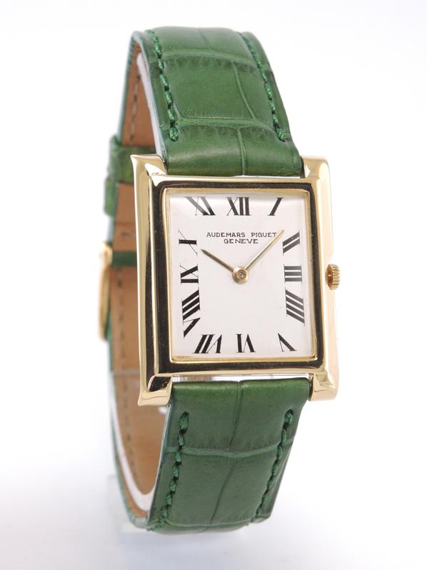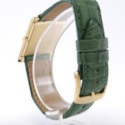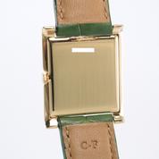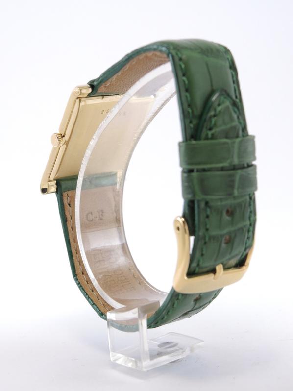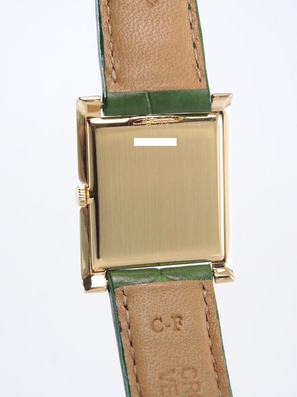 Boitier en or jaune ultra plat sur bracelet cuir, 26 x 32 mm, cadran blanc avec indexes chiffres romains, aiguilles bâton, verre minéral, mouvement mécanique ultra fin, calibre 2003 (1.64 mm).
