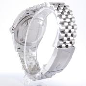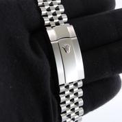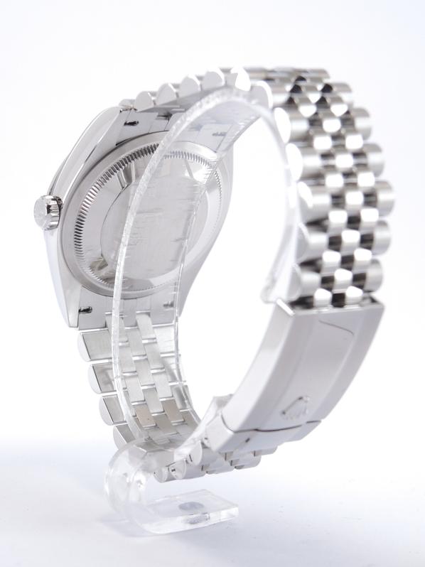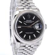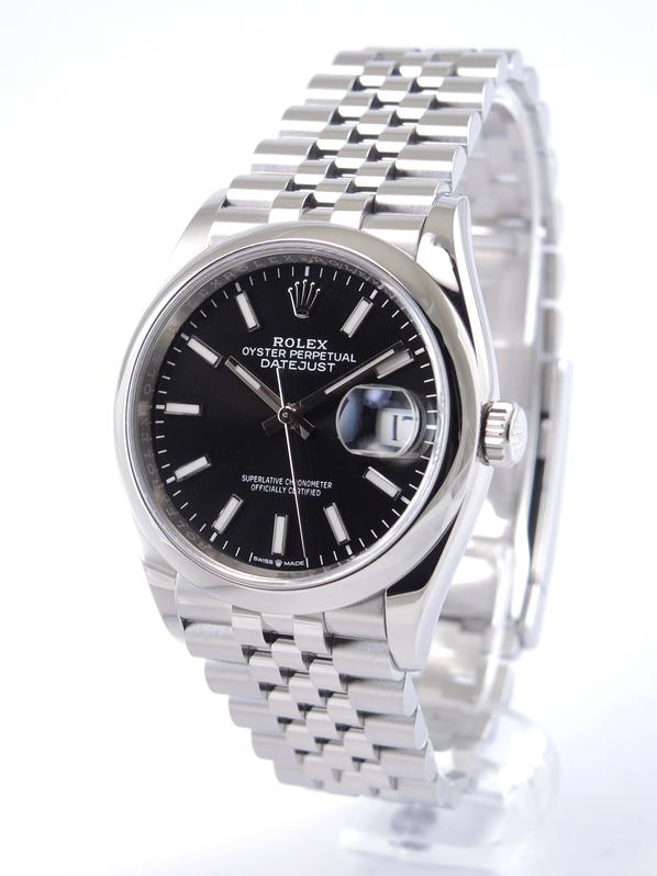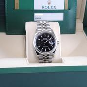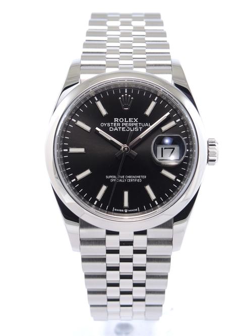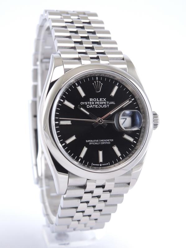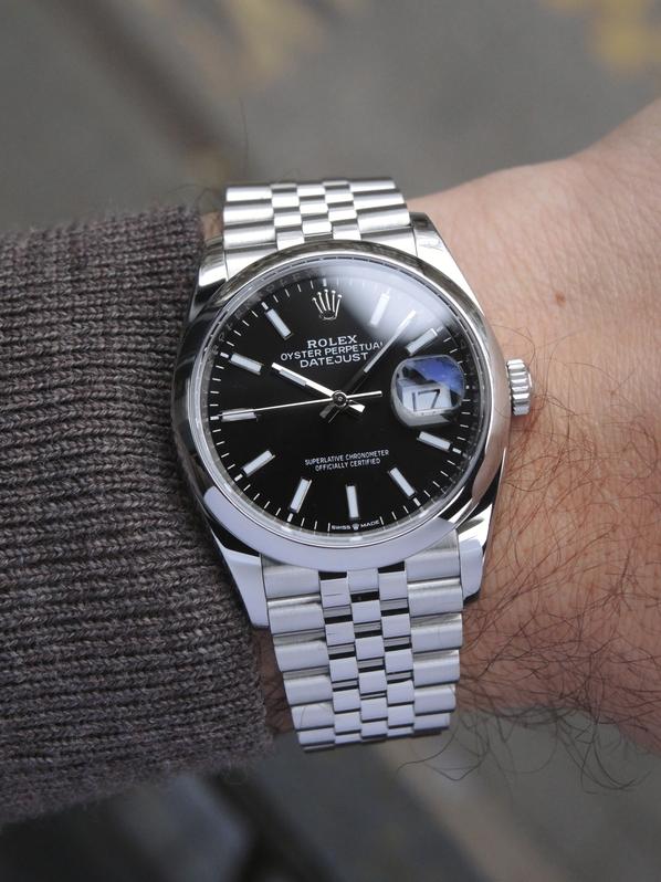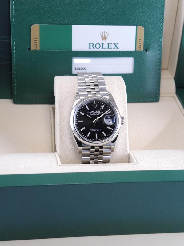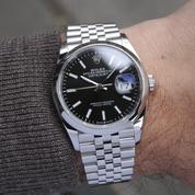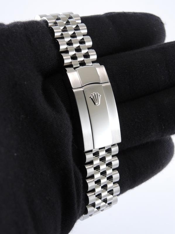 Complet acier, bracelet "Jubilé", cadran noir soleillé, index bâtons, date, lunette lisse, verre saphir, couronne vissée, mouvement automatique certifié chronomètre (COSC). Avec boîte et papiers d'origine, set complet !
