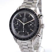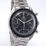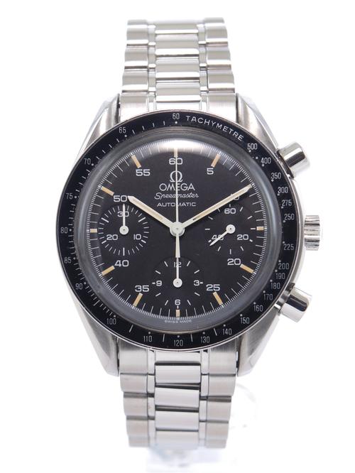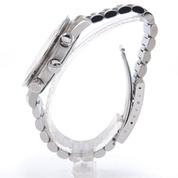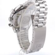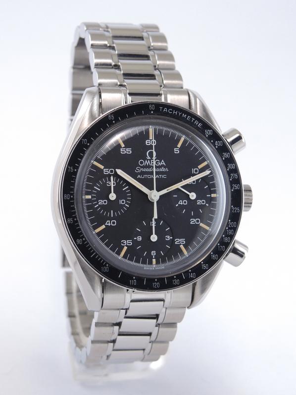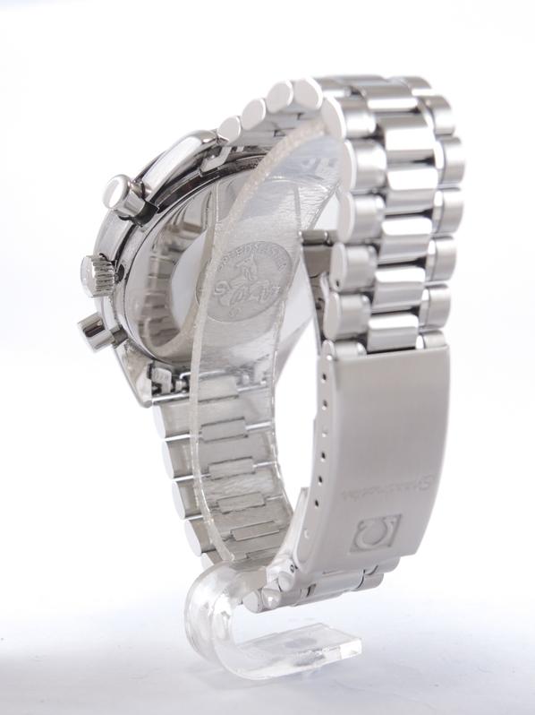 Full steel, cadran noir "Swiss Made", chronographe, trois compteurs, index bâtons légèrement patinés, lunette graduée, verre plexi, mouvement mécanique à remontage automatique.
