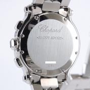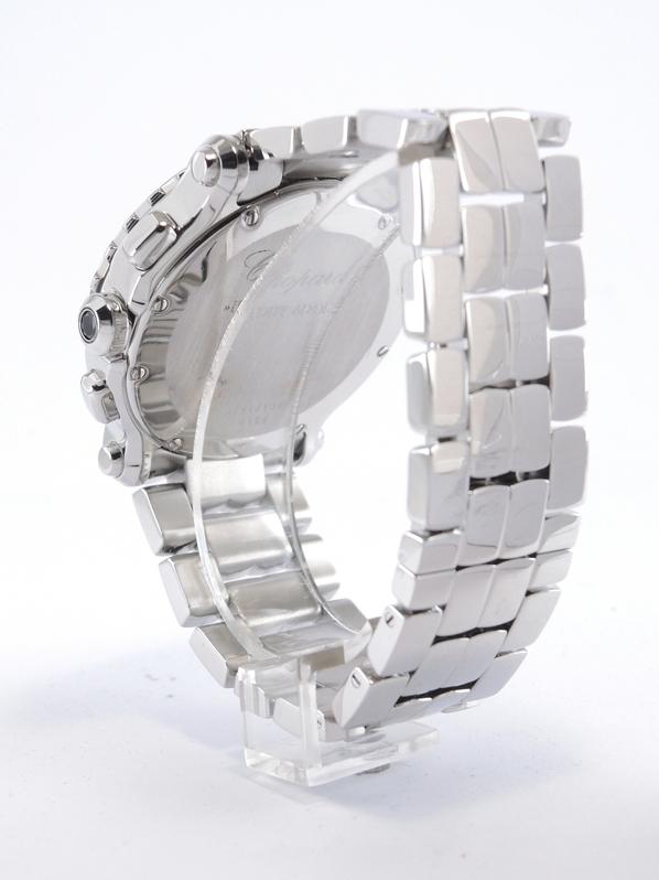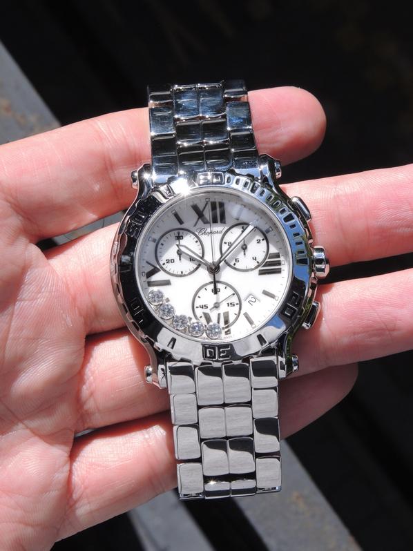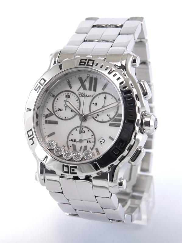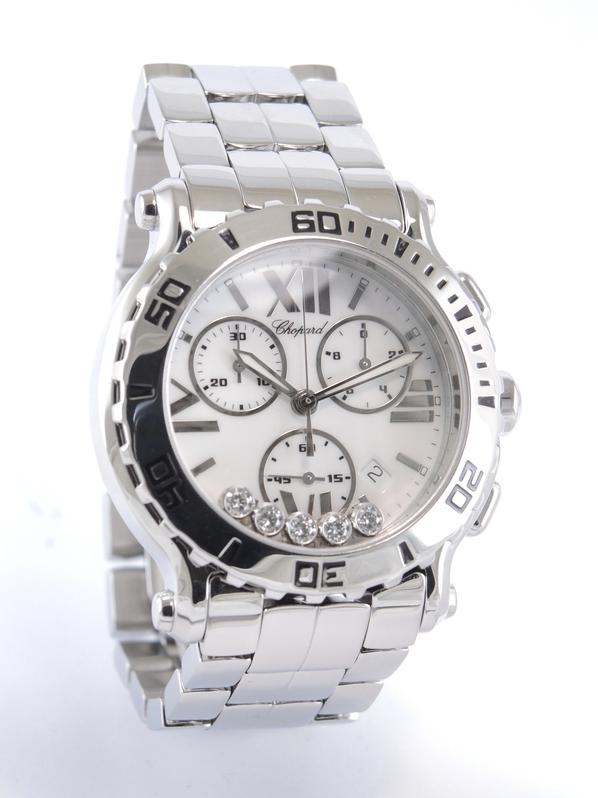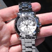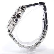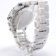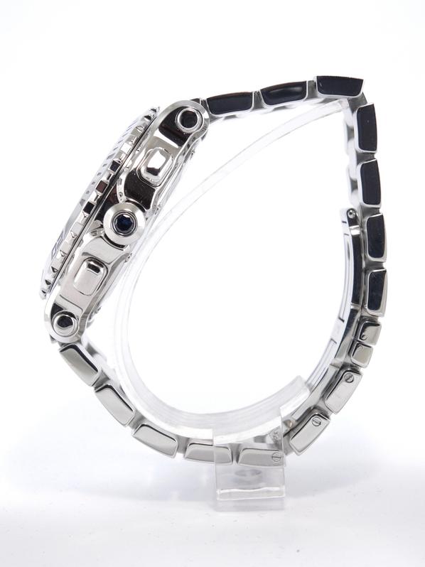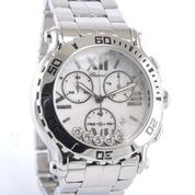 Full steel, white dial, roman numeral markers, chronograph, three registers, date, sword shaped hands, rotating bezel, sapphire glass, 5 diamonds, quartz movement.