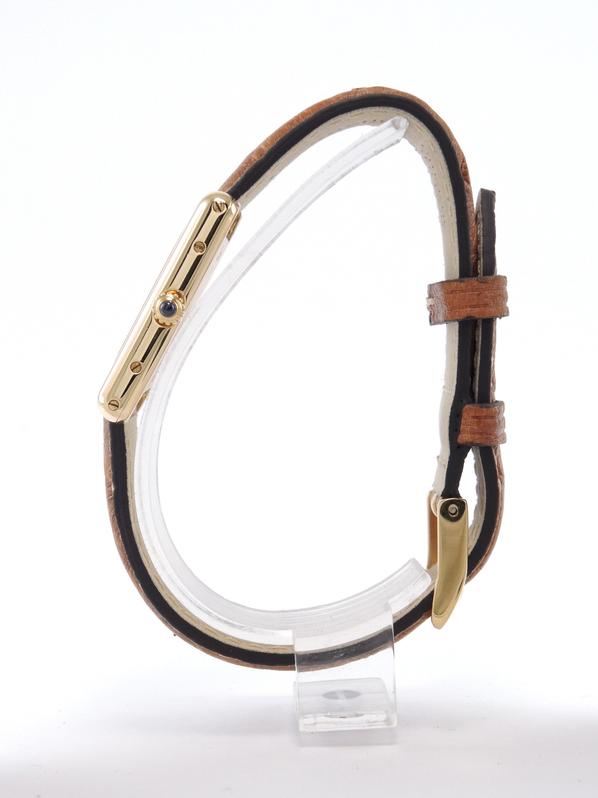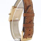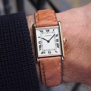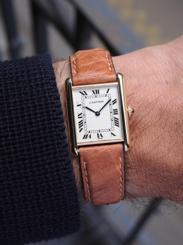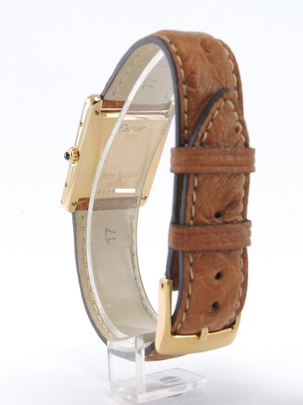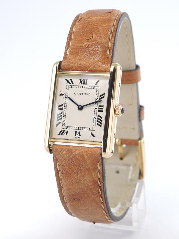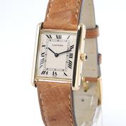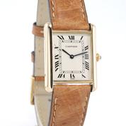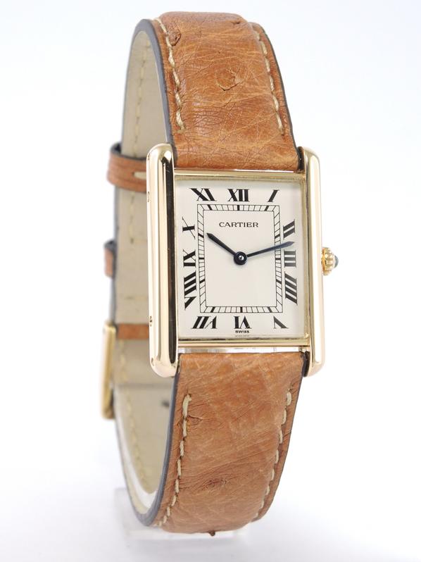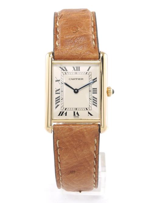 Yellow gold case on leather strap, 24 x 30 mm, pin buckle, white "Swiss" dial with roman numeral markers, chapter ring, "sword shaped" hands, quartz movement. The Cartier Tank, introduced in 1917, redefined watchmaking with a design inspired by the sleek lines of WWI armored vehicles. From the turmoil of the first mechanized conflict emerged a masterpiece of elegance and innovation, an iconic wristwatch that continues to captivate collectors and connoisseurs alike.