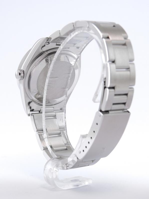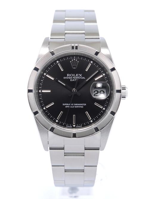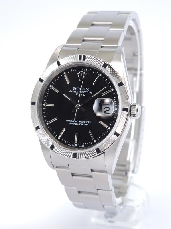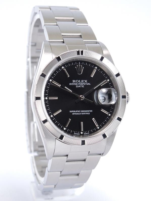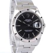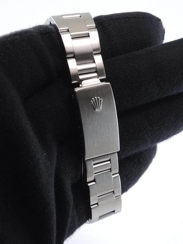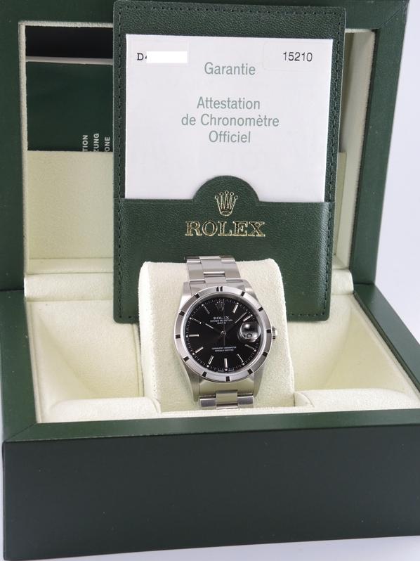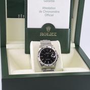 Full steel, Oyster bracelet, black "Swiss Made" dial, applied stick markers, sapphire glass, engine turned bezel, screw down crown, automatic movement. With original box and papers, full set!