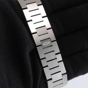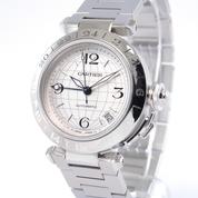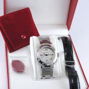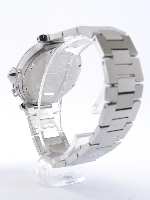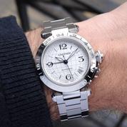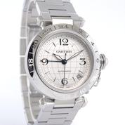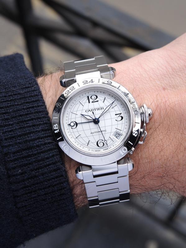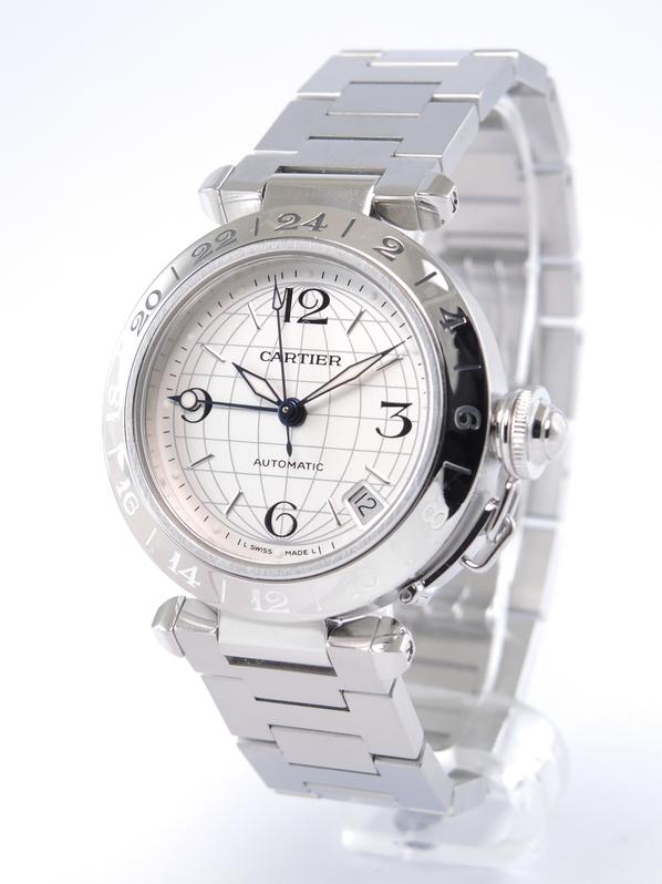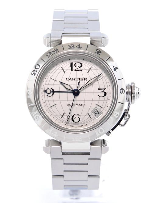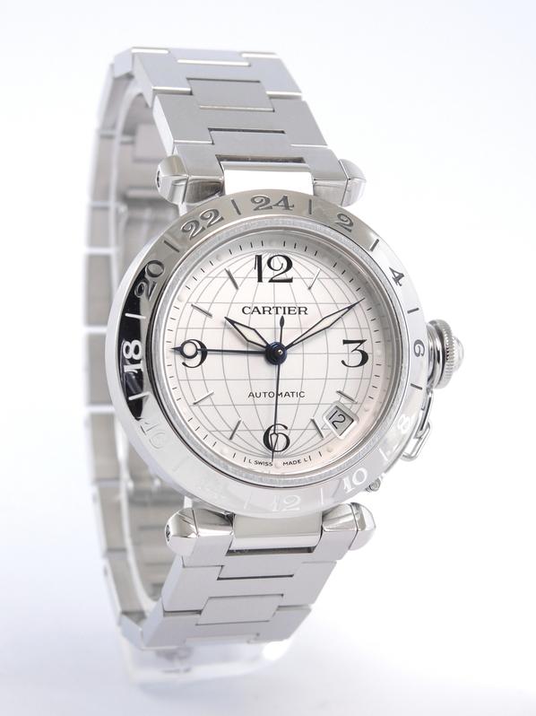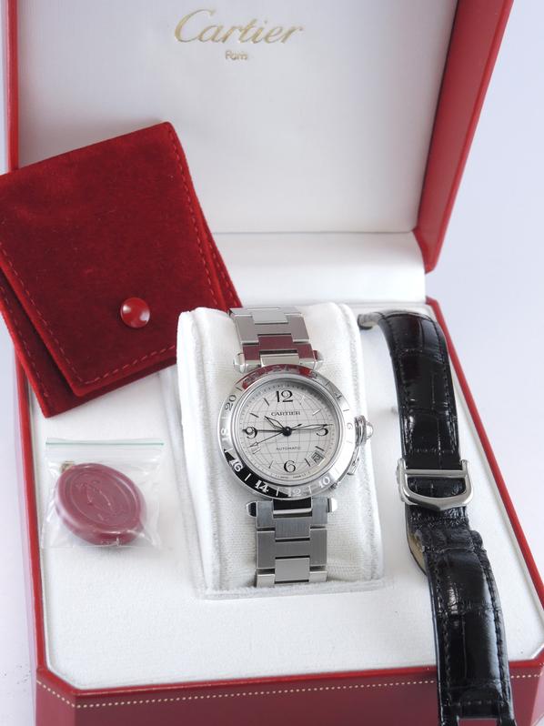 Full steel, additional leather strap, silver dial, arabic numeral markers, second time zone, date, sapphire glass, rotating bezel, automatic movement. With original box.