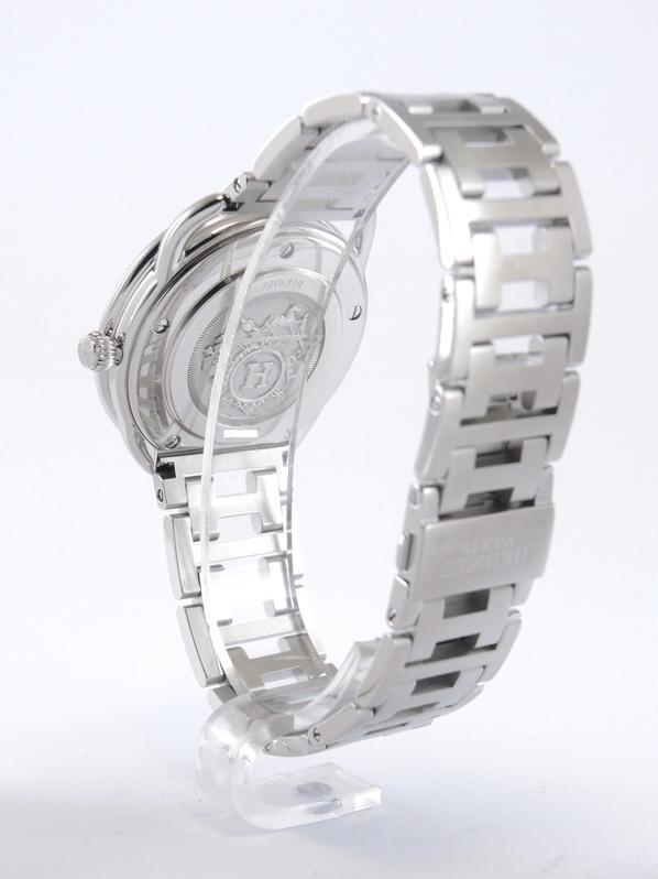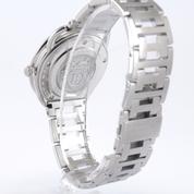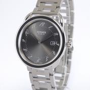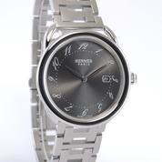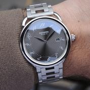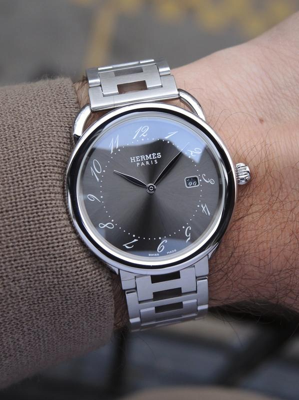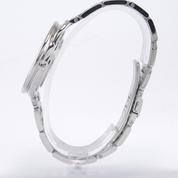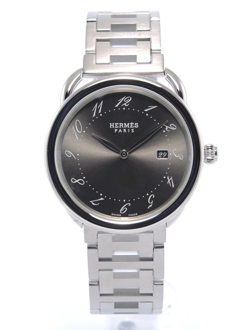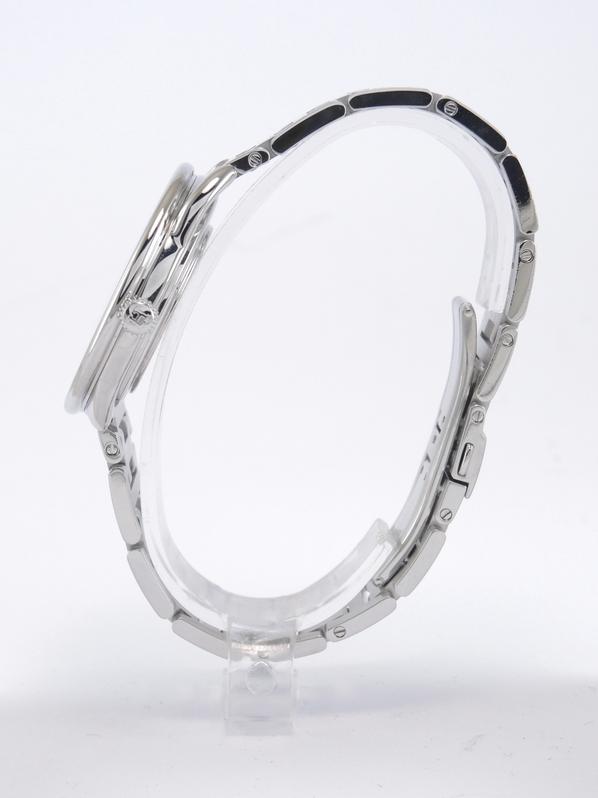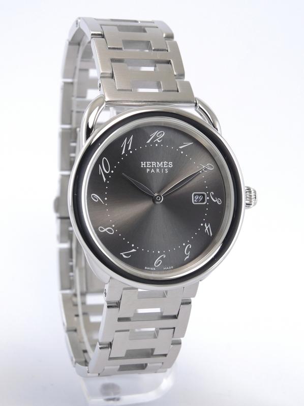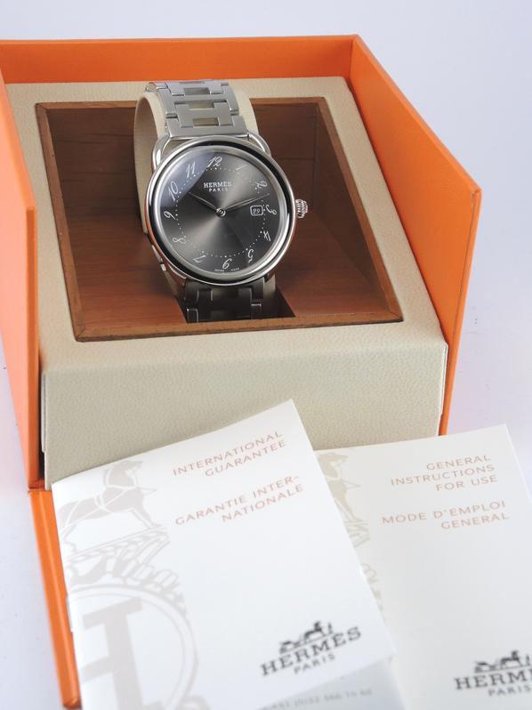Full steel, grey sunburst dial, arabic numeral markers, leaf shaped hands, date, sapphire glass, quartz movement. With original box and papers, full set!
