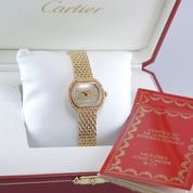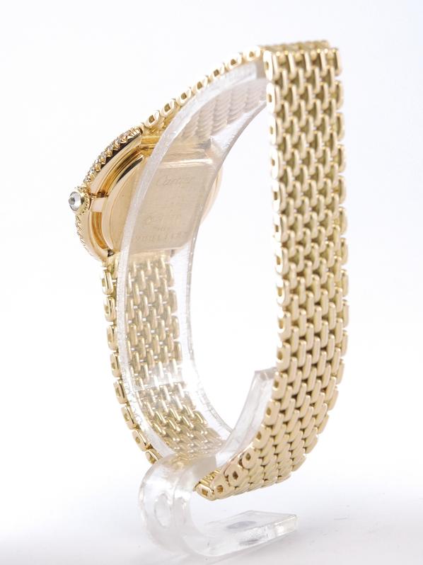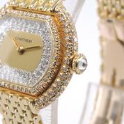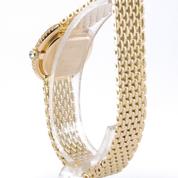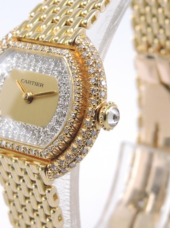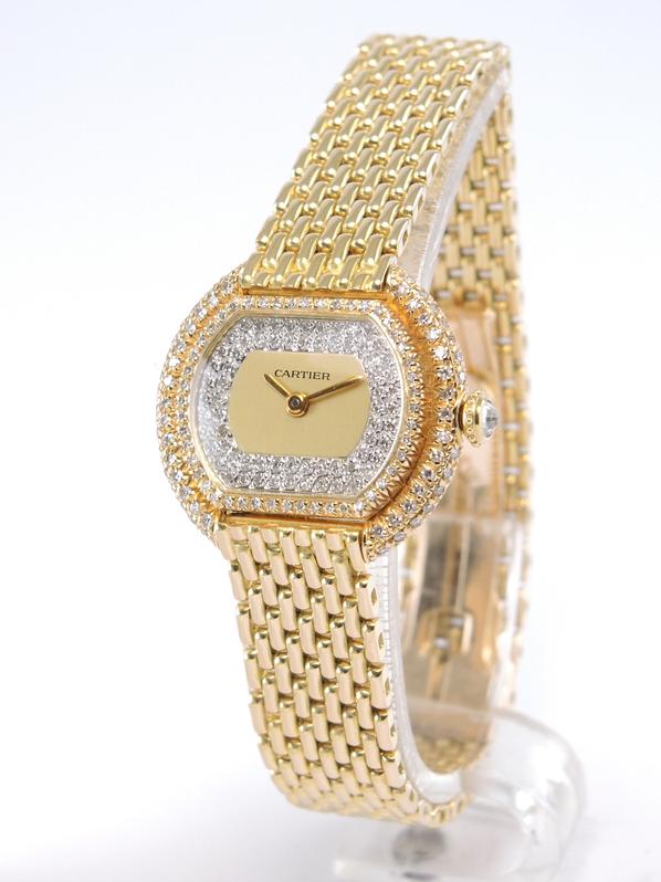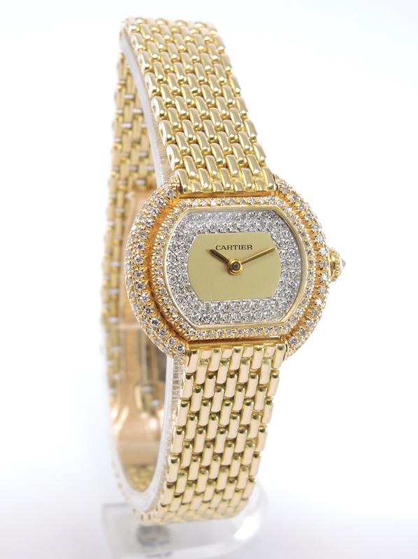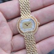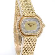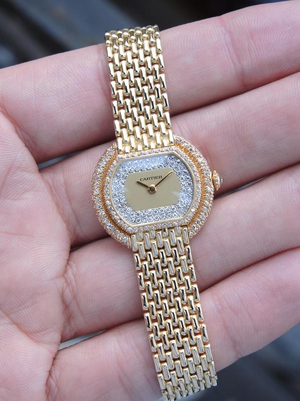 Full yellow gold, diamond set case, diamond paved dial, sword shaped hands, mineral glass, diamond cabochon, hand wound movement. With original box and papers, full set! Max size : 15.5 cm.