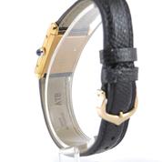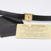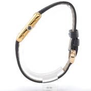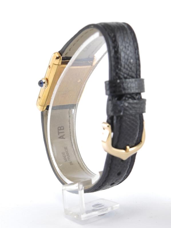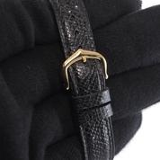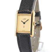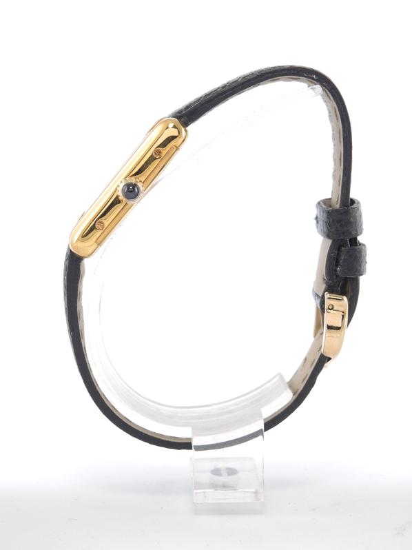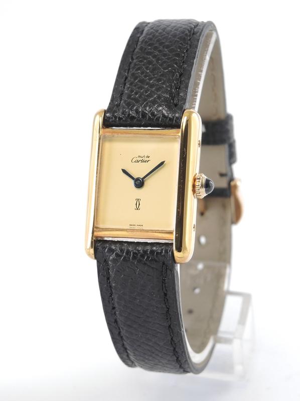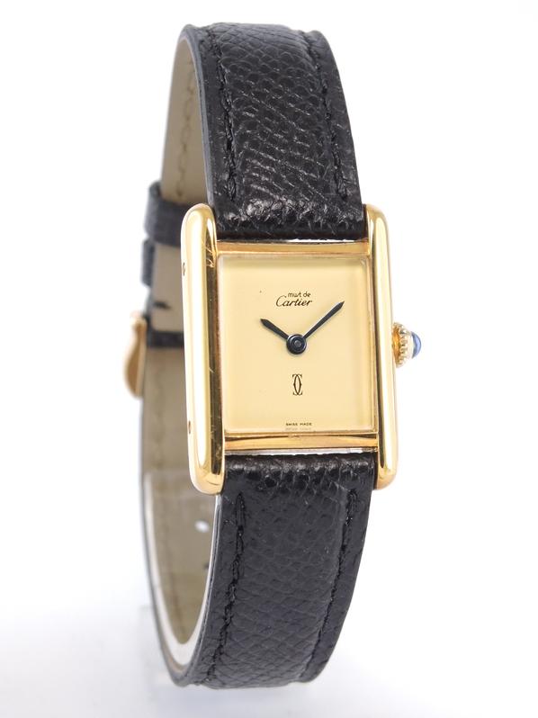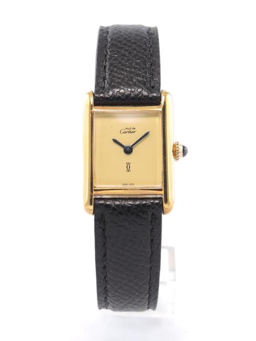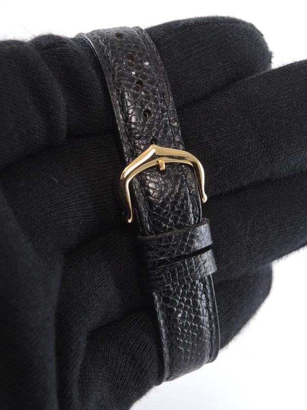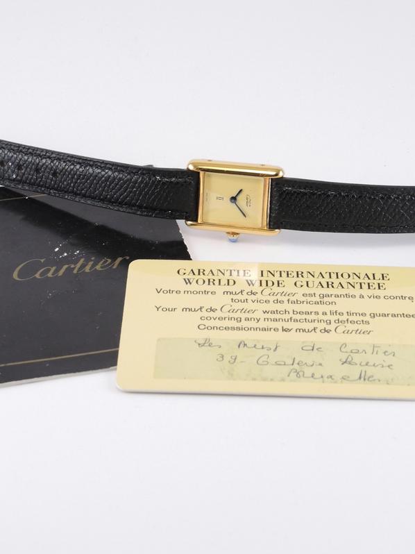 Gold plated case on leather strap, 21 x 28 mm, original pin buckle, "ivory" dial, sword shaped hands, mineral glass, hand wound movement. With warranty card.
