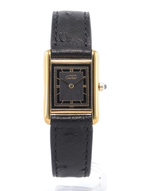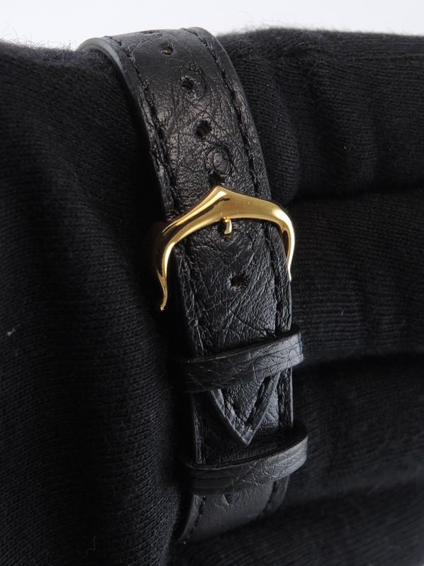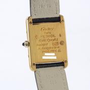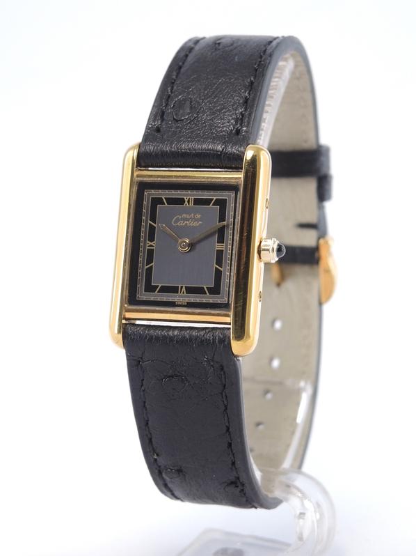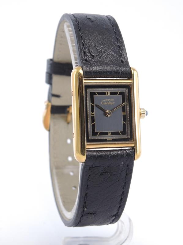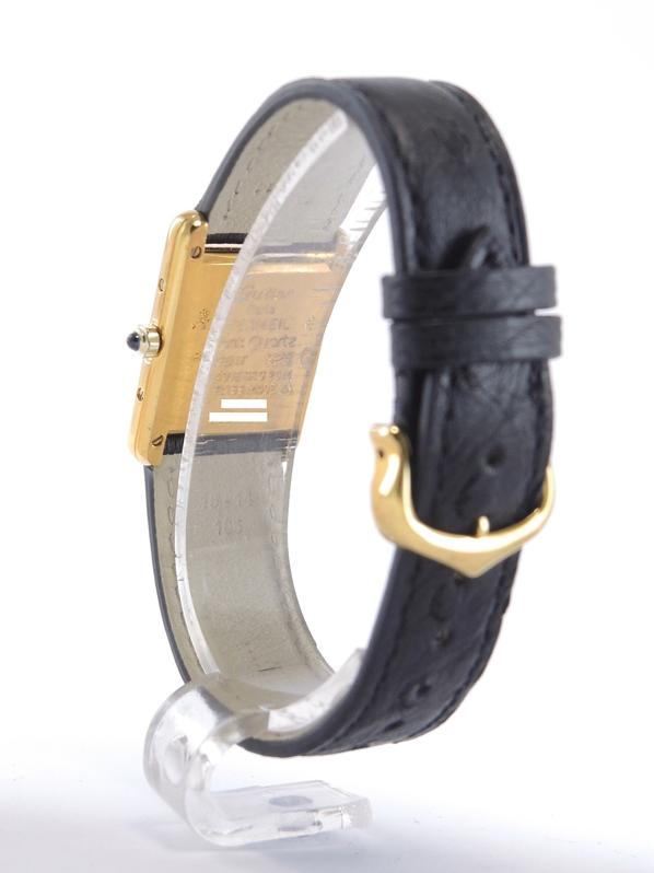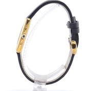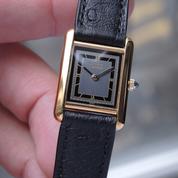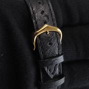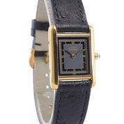 Gold plated case on leather strap, 21 x 28 mm, original pin buckle, grey & black dial, roman numeral markers, golden sword shaped hands, mineral glass, quartz movement.