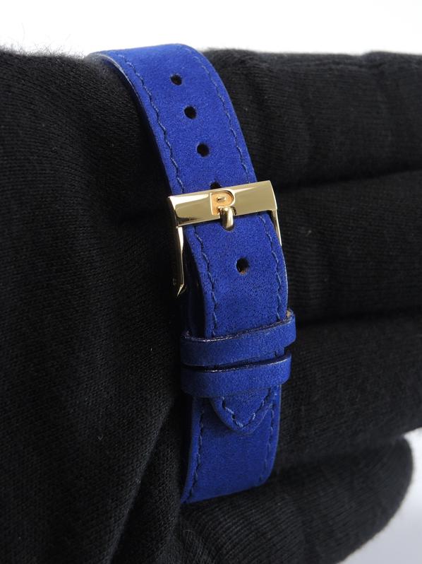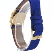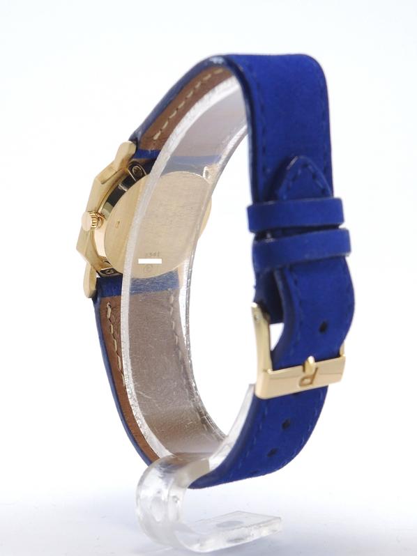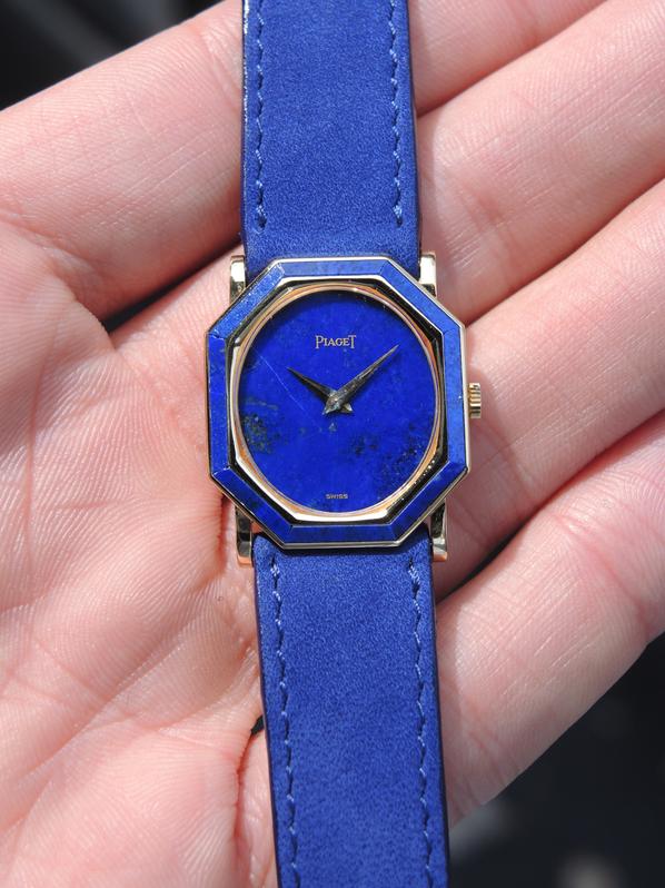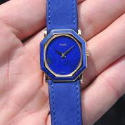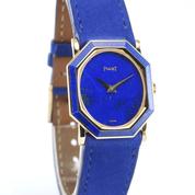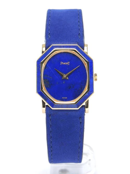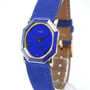 Yellow gold case with Lapis Lazuli inserts, 24 x 26 mm, leather strap, original pin buckle, blue Lapis Lazuli dial, golden dauphine hands, mineral glass, hand wound movement.