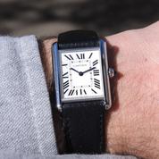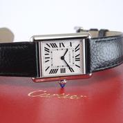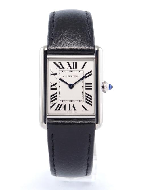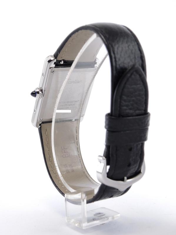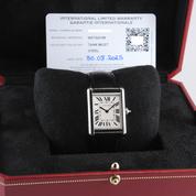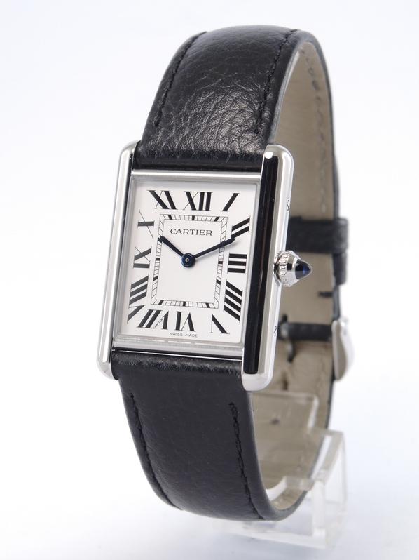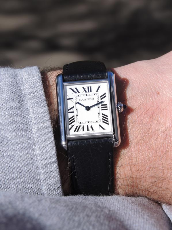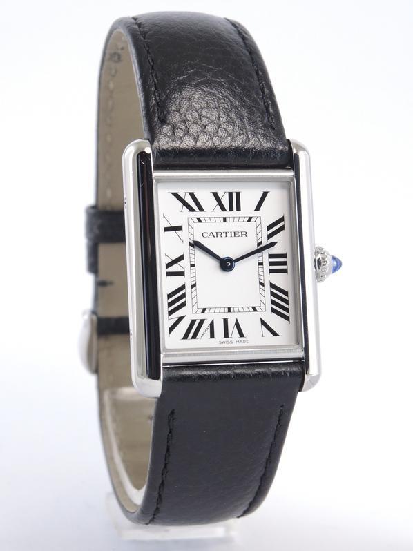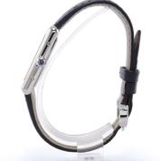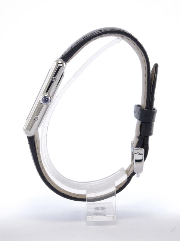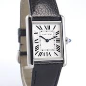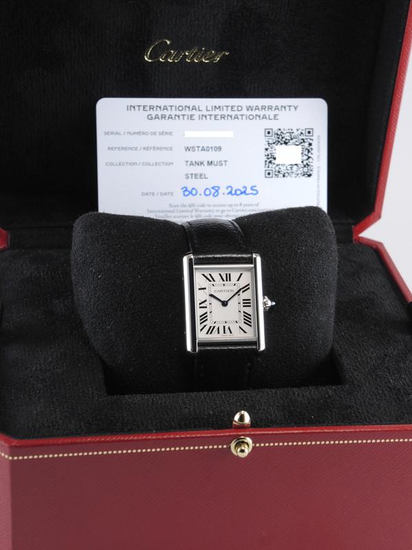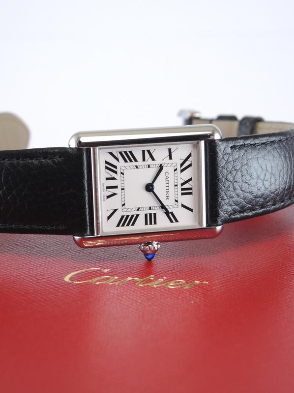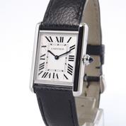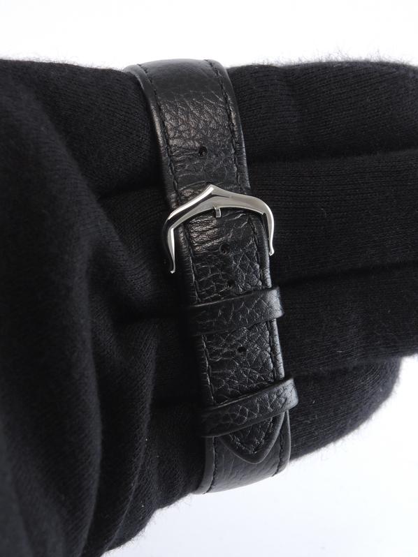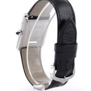 Steel case on leather strap, original pin buckle, 26 x 34 mm, silver dial with roman numerals, chapter ring, blued sword shaped hands, sapphire glass, quartz movement. With original box and papers, full set!