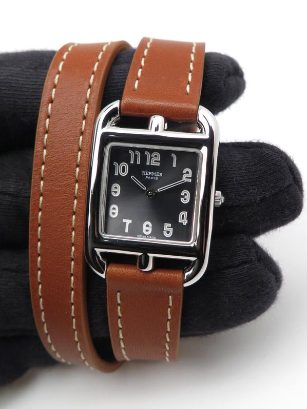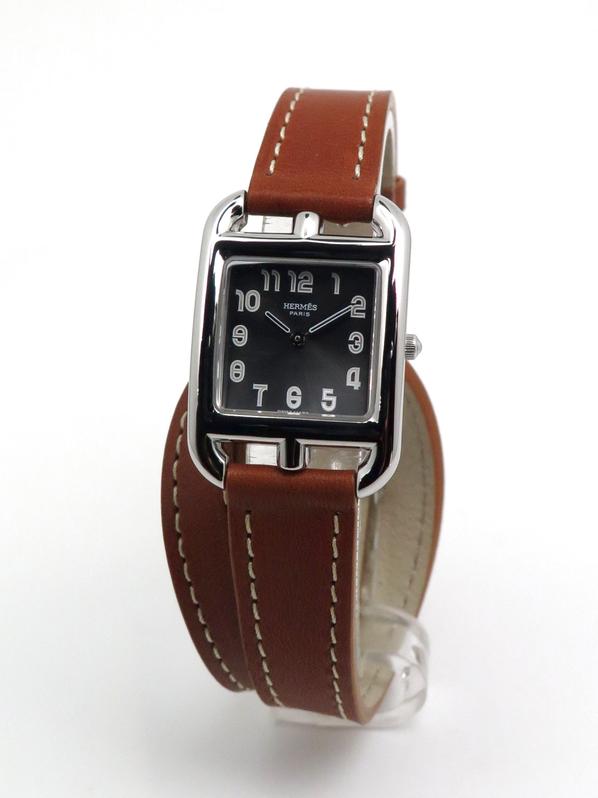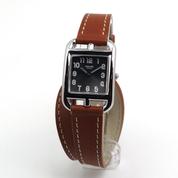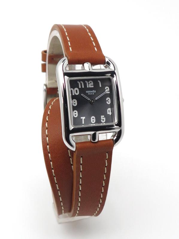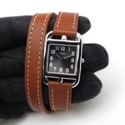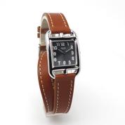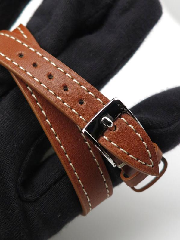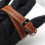 Acier sur bracelet cuir caramel double tour avec ardillon , cadran gris canon de fusil avec index chiffres arabes , verre saphir , mouvement quartz calibre 976.001 , 35X23