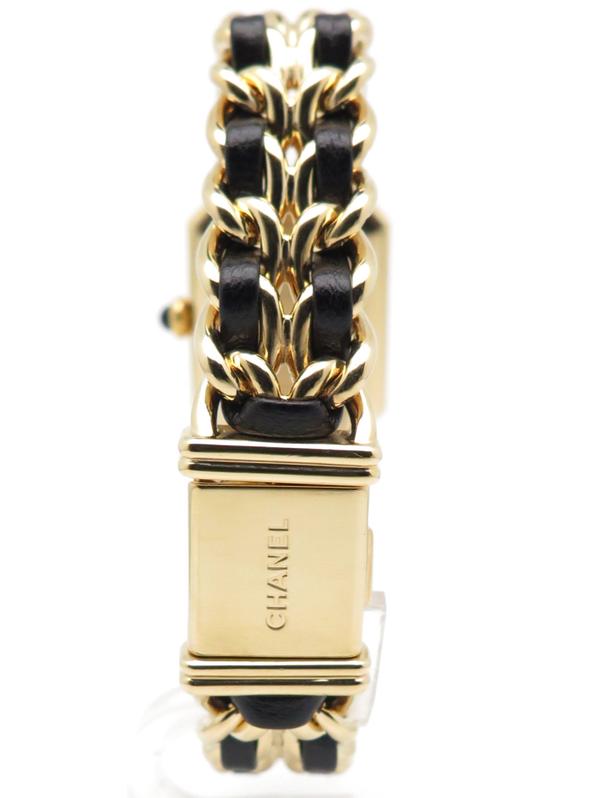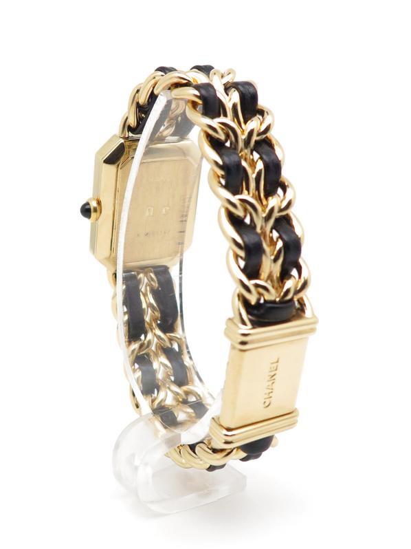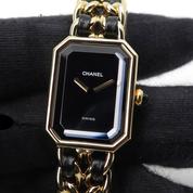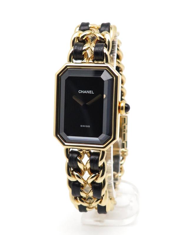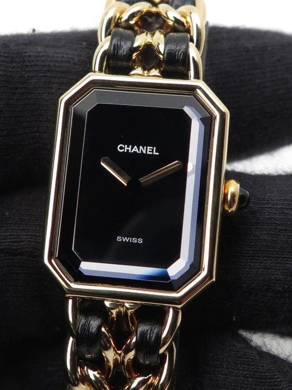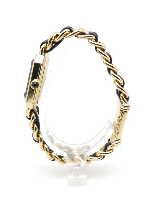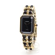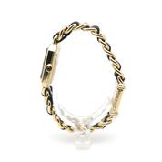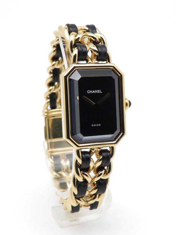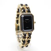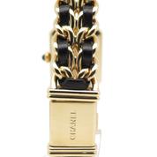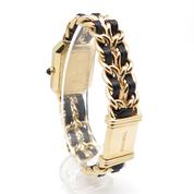 20m yellow gold plate case and bracelet, black dial and black leather lace, beveled sapphire crystal, crown with black cabochon, quartz movement